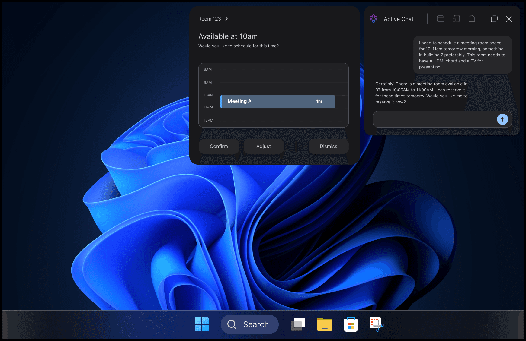 The Room Concierge confirms her reservation and sets up the space accordingly. When the meeting ends, the room powers down and sends an AI-generated summary to all participants.