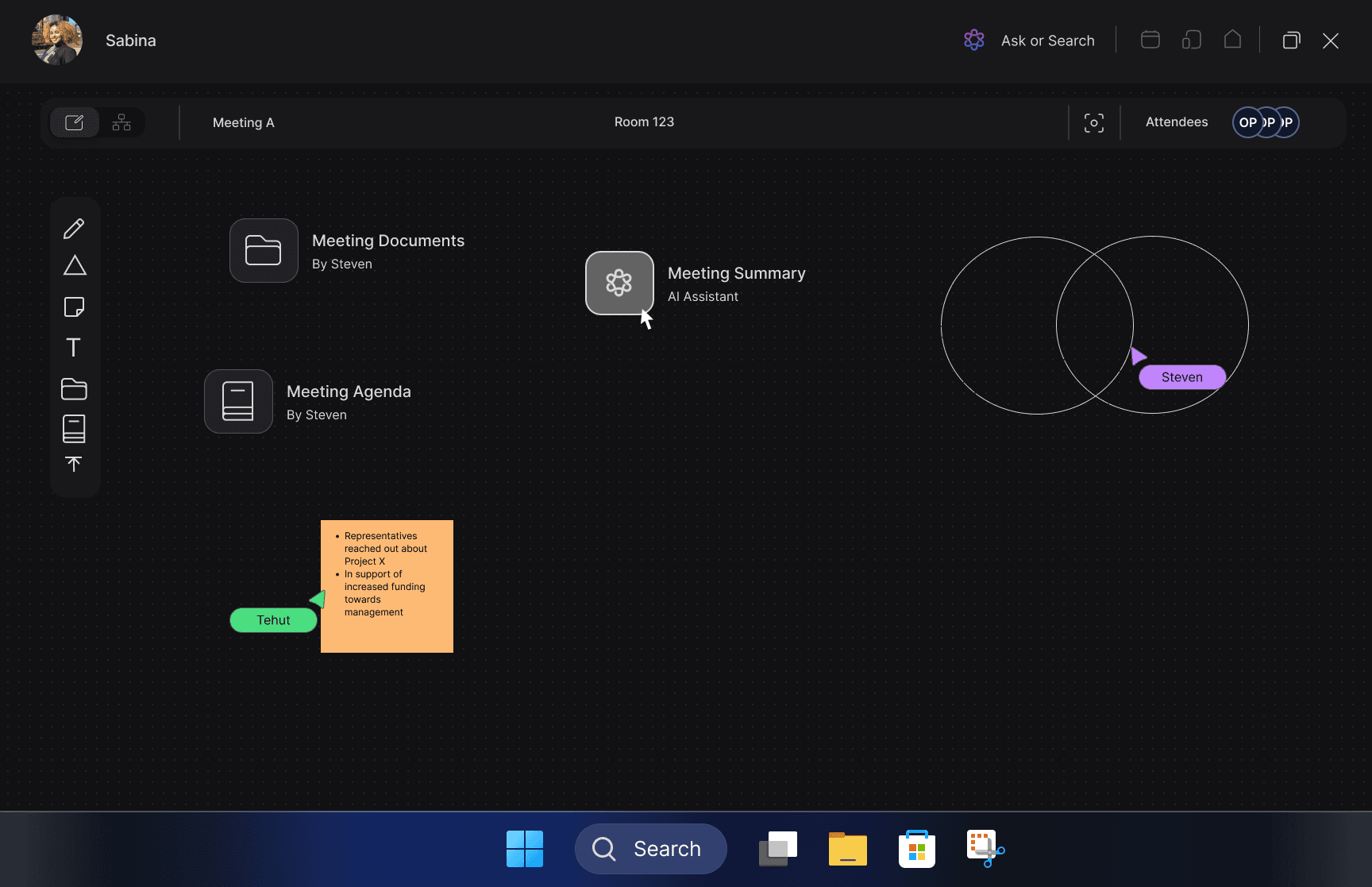 An open, spatial workspace where documents, agendas, notes, and participants coexist. Users can collaboratively contribute ideas, while an AI assistant captures summaries and key takeaways in real time.
