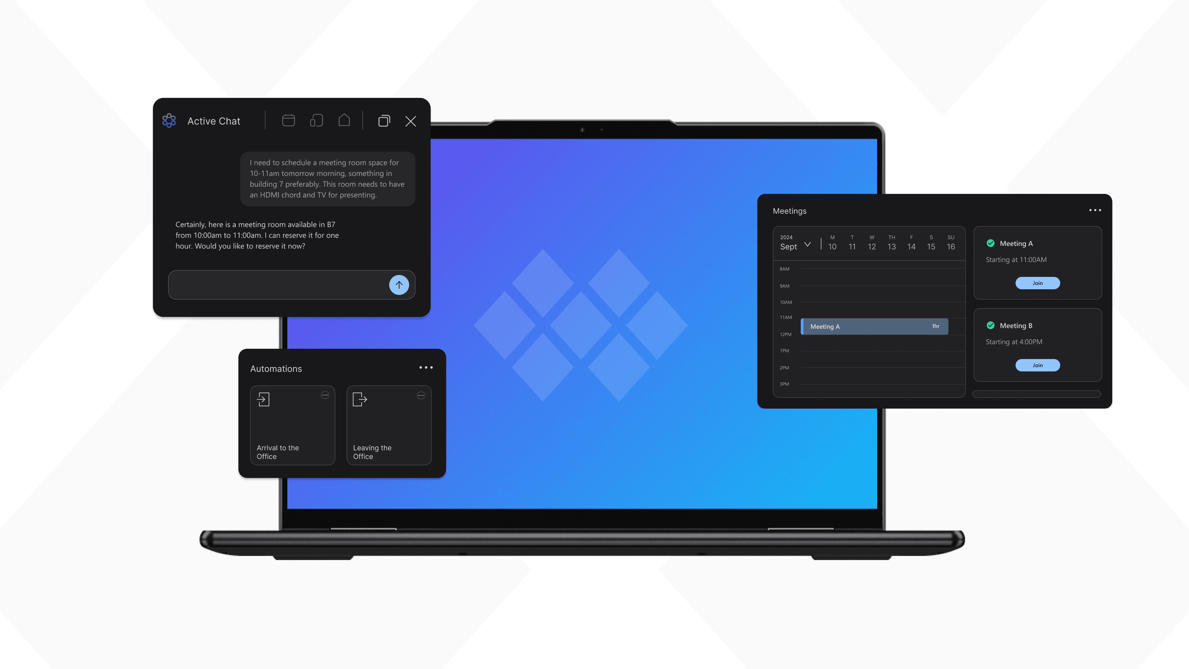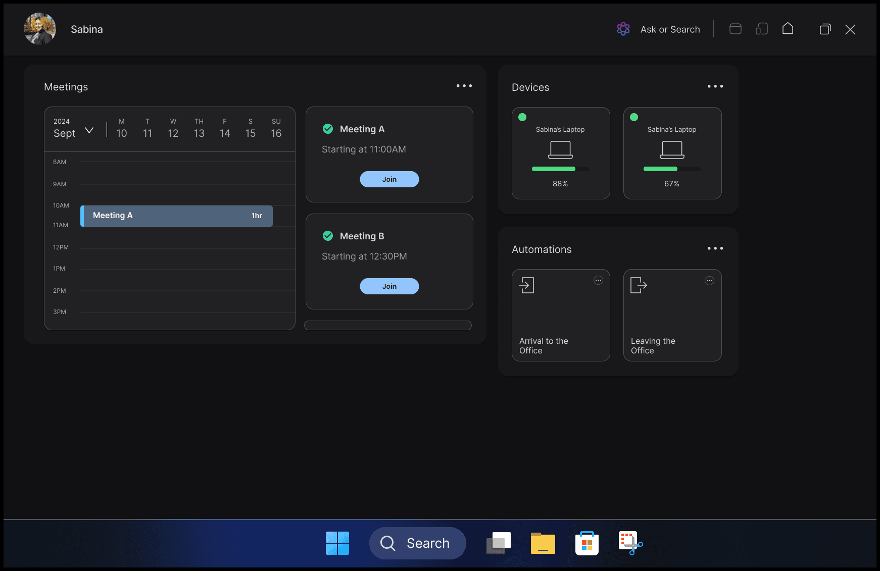 The dashboard provides a consolidated view of upcoming meetings, active sessions, connected devices, and automations. Users can quickly join meetings, monitor device readiness (battery, connection status), and trigger contextual automations tied to their location or schedule. This creates a single source of truth for both digital and physical work environments.